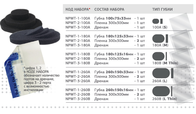 NP 800: Дренажные наборы включают: дренаж с 1-просветным портом или дренаж с 2-просветным портом с возможностью инстилляции, губку разного размера, пленку