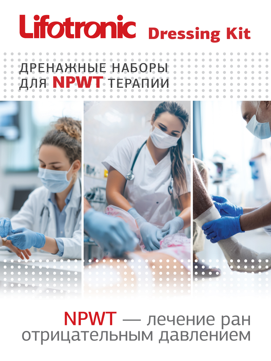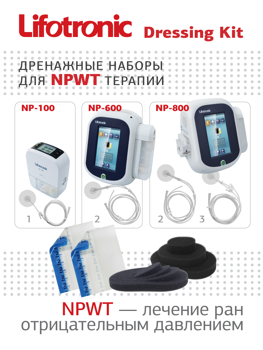 • ТИП ДРЕНАЖА И СОВМЕСТИМОСТЬ — три типа дренажа для разных моделей аппаратов NPWT Lifotronic, аппликатор округлой формы небольшого размера для возможности наложения на небольшие раны.